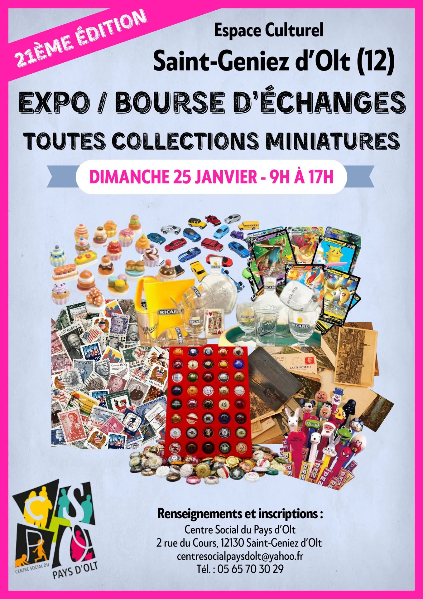 Le Centre Social du Pays d’Olt organise cette exposition-bourse multicollections de miniatures : Fèves, Timbres, Cartes postales, Capsules de champagne, Jouets anciens, Pin’s, et autres…
